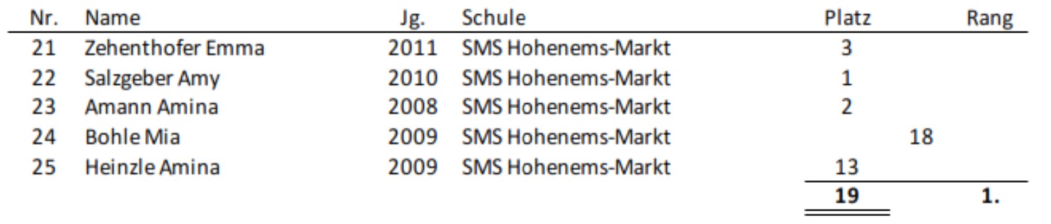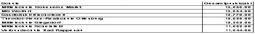 Mädchen: 2. SMS Hohenems-Markt: 383 Punkte: Ceren Kaya, Jana Bohle, Sarina Glanzer, Maja Hilbe, Timna Kopf, Jana Feurle, Betreuerin: Jutta Jank