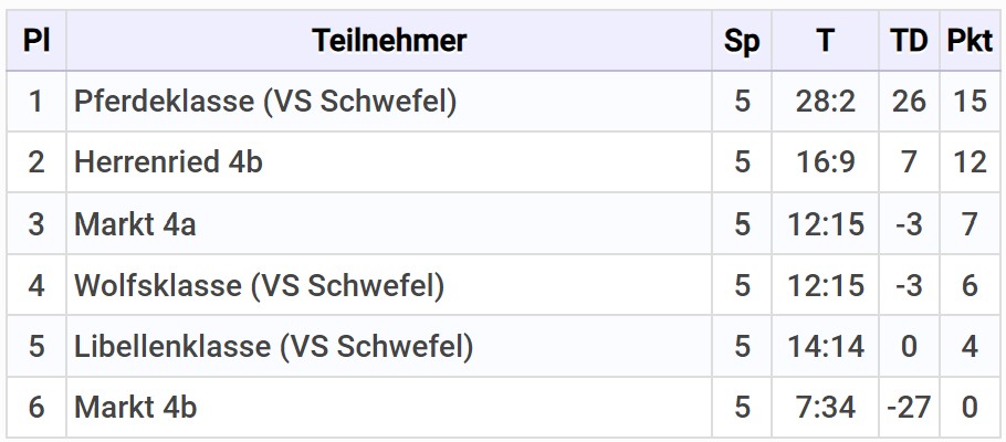 Die 4d Klasse Markt gewann ohne Punkteverlust und mit einem Torverhältnis von 35:3 das Turnier. Gratulation an das Team und natürlich den Betreuern!
