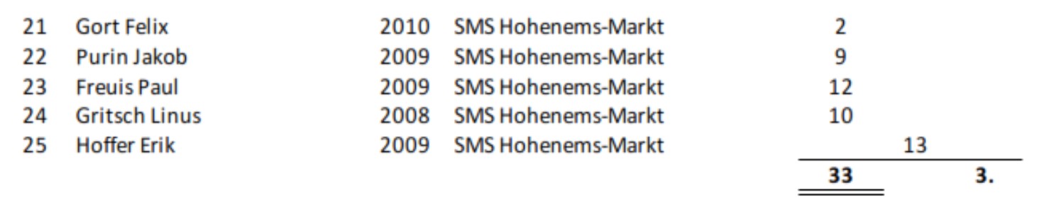 Burschen: 2. SMS Hohenems-Markt: Johannes Fenkart, Jonas Kubu, Leon Giesinger, Kim Gahan, Luca Pöschl, Dominik Prugg, Betreuer: Arno Habian