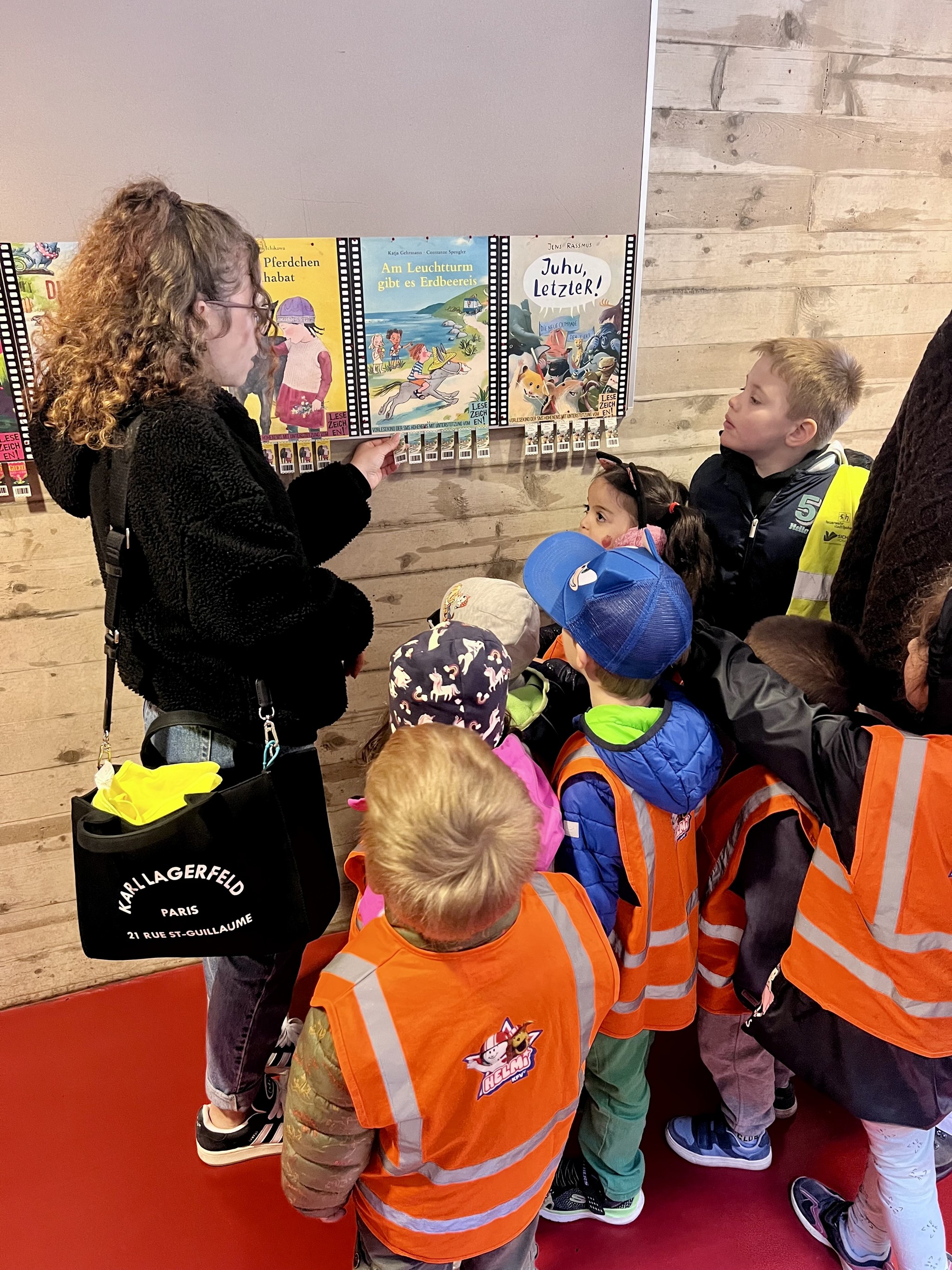 Zur Auswahl standen neue Werke der Kinderbuchliteratur, die in Zusammenarbeit mit der Buchhandlung Lesezeichen ausgewählt und von Schülerinnen und Schülern aus den dritten und vierten Klassen vorgelesen wurden. Nachdem sich die Kinder für eine Vorstellung ihrer Wahl entschieden hatten, erhielten sie ein Ticket und fanden damit Einlass in den speziell dafür gestalteten Kinosaal in der Turnhalle. Im Anschluss an die Veranstaltung konnte sich jeder Kindergarten noch ein Kinderbuch für die eigene Bibliothek aussuchen.