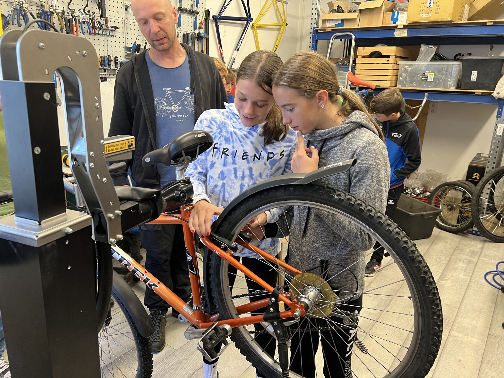 Eine Gruppe lernte bei einem Fahrradexperten, wie man sein Fahrrad selbst repariert: Hinterreifen entfernen, einen neuen Schlauch anbringen, Bremsen ein- und aushängen,...