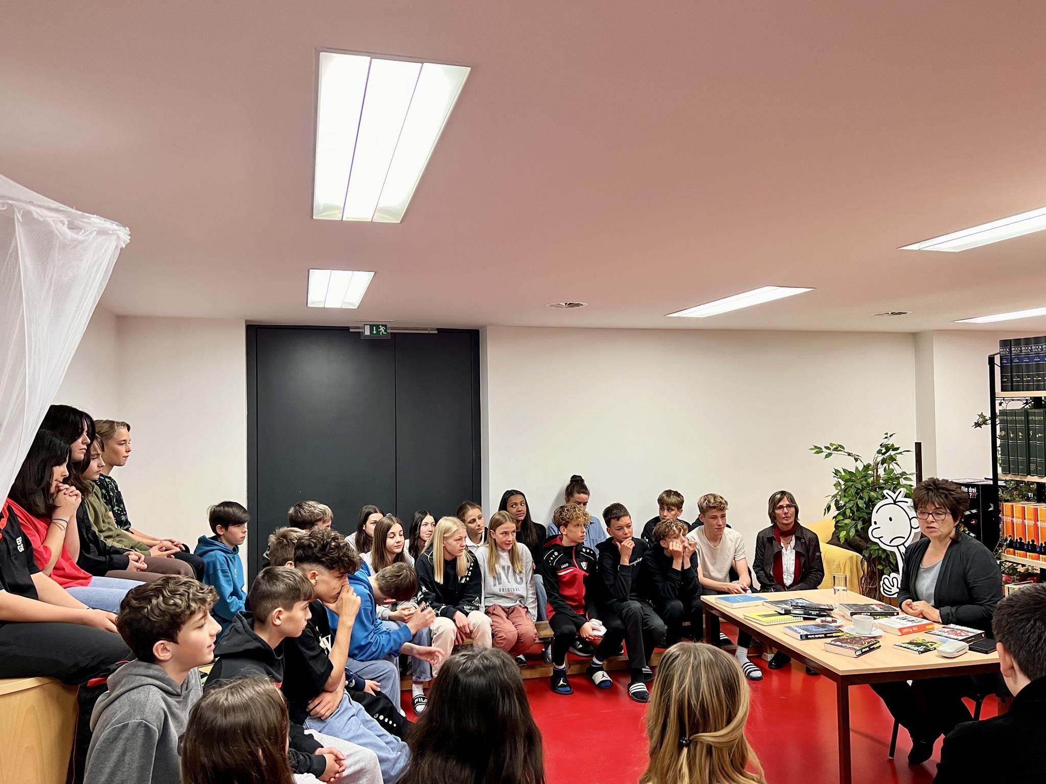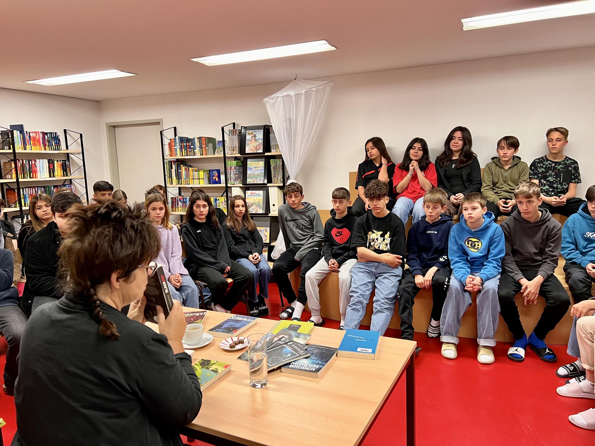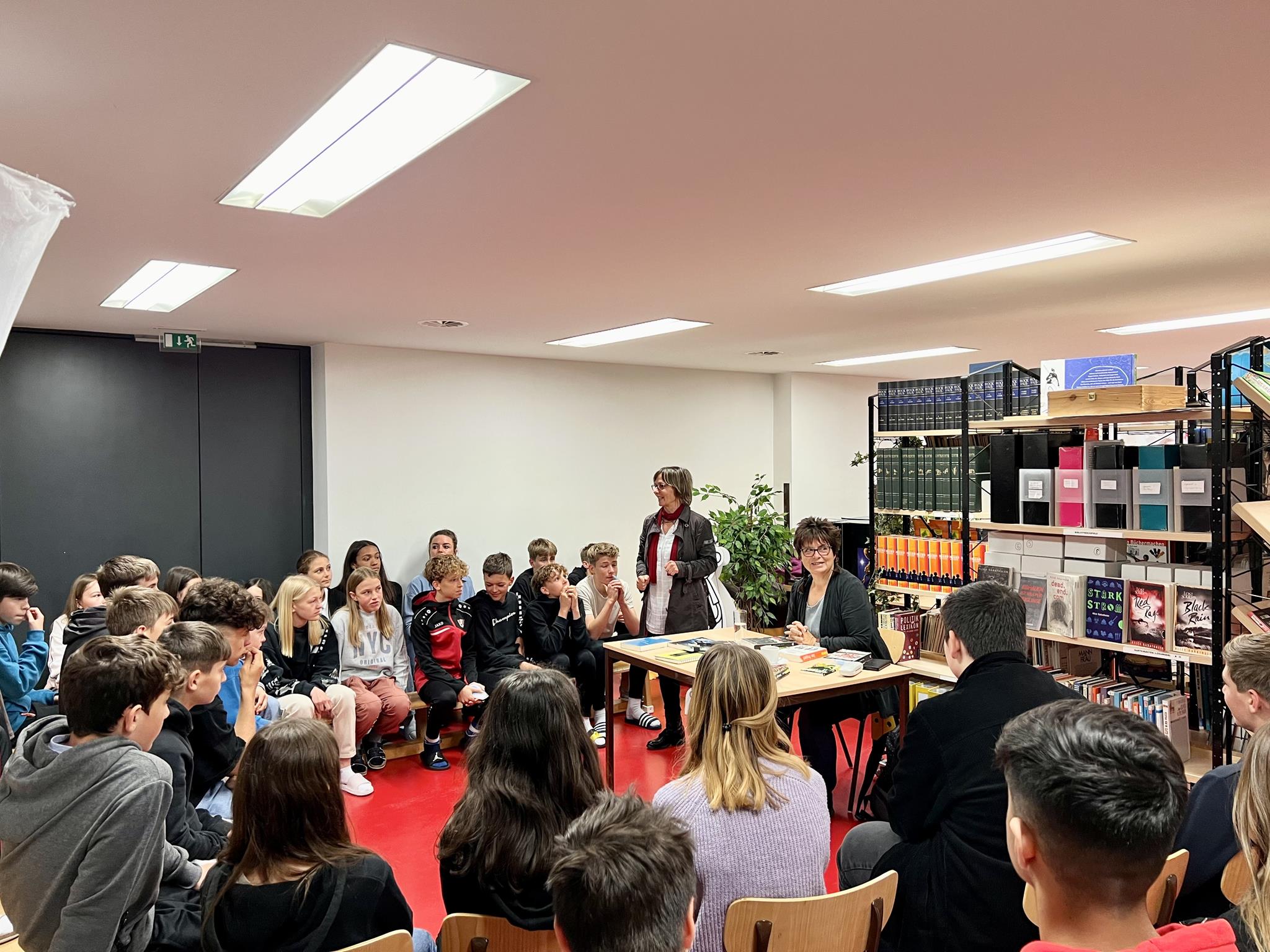 Auch heuer gab es in der Bücherei der Mittelschule Markt wieder eine Lesung mit der bekannten Jugendbuchautorin aus dem Schweizer Rheintal Alice Gabathuler. Sie erzählte den Drittklässlern zuerst von ihrem Werdegang zur Autorin und die Schüler/innen stellten Fragen zu ihrem Alltag als Schriftstellerin. Sie berichtete auch über die Schwierigkeiten mit ihrem Verlag, der das Buch „Schlechte Karten“ nicht mehr neu auflegen wollte. Also nahm sie Satz, Layout und Cover in die eigene Hand und so erschien das Buch unter dem Titel „Mörderbruder“ neu. Während die eine Gruppe in den Genuss kam, Textstellen aus diesem Buch zu hören, wählte die andere eine Kostprobe aus dem Buch „Red Rage“ aus der Reihe „Lost Souls“. Am Schluss signierte sie das neu erschiene Buch und überließ ein Exemplar der Bücherei.
