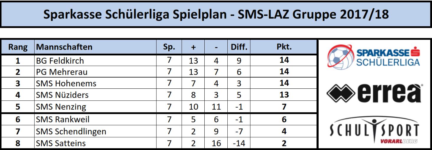 Bei den Mädchen erkämpfte sich die SMS Wolfurt den 2. und die SMS Nüziders den 3. Rang, während die Knaben aus Nüziders Rang 2 und die Wolfurter Buben Platz 3 belegten. Beide Schulmannschaften können somit beim internationalen Bodensee-Schulcup in Bregenz mitmachen. Die Mädchen und Buben der Gastgeberschule Rankweil belegten jeweils den undankbaren 4. Rang.
